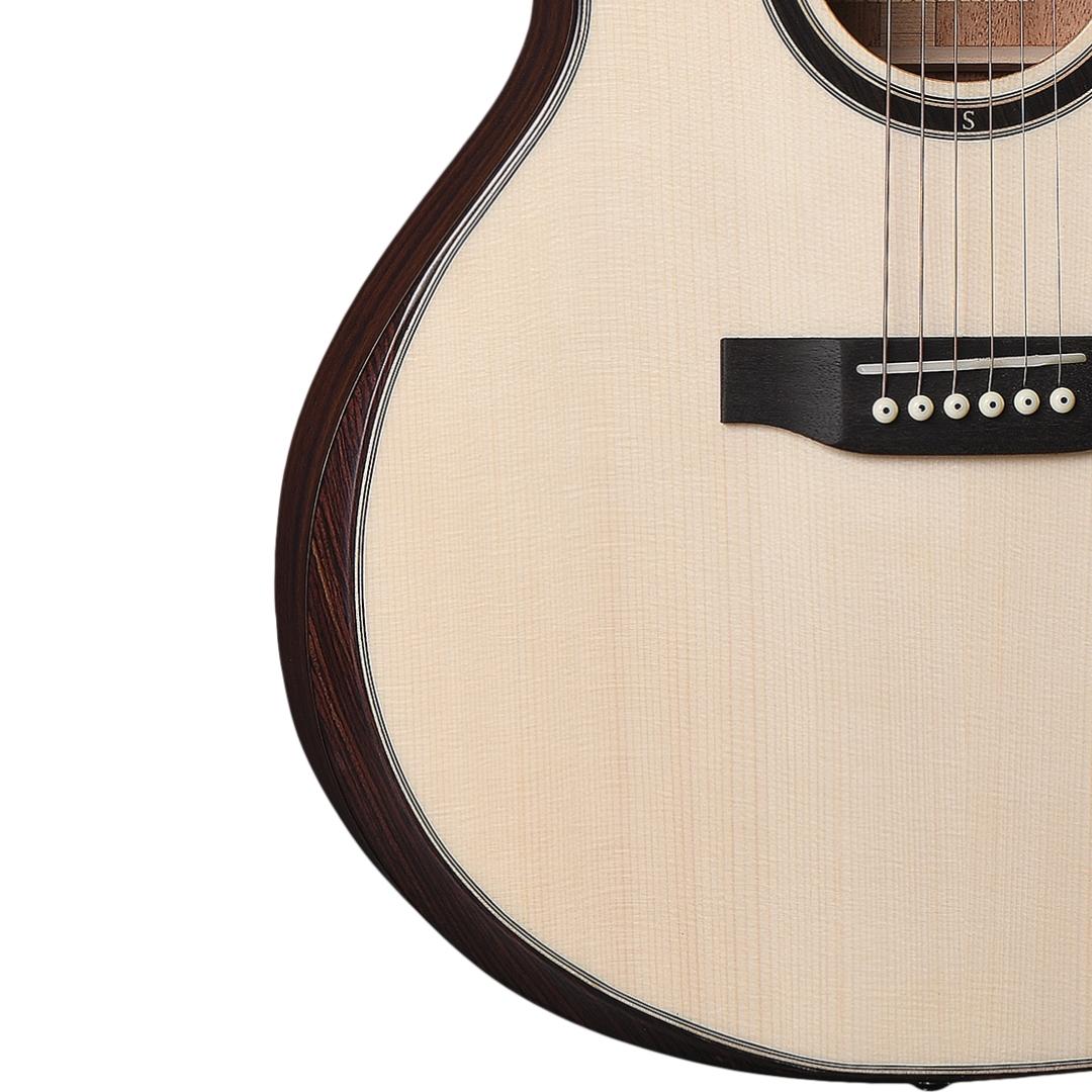 This eye-catching acoustic electric guitar is made with a grand auditorium body size, on which is mounted a mahogany neck. The choice of Grand Auditorium size means that the guitar is slightly smaller than a dreadnought. That makes it suitable for those who find a dreadnought to be a little too large, or those who stand up a lot when playing the guitar. The Grand Auditorium model is also slightly more focused in the midrange, which makes it extra suitable for finger playing.
