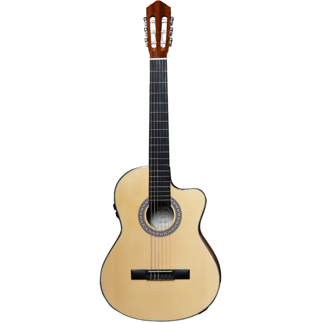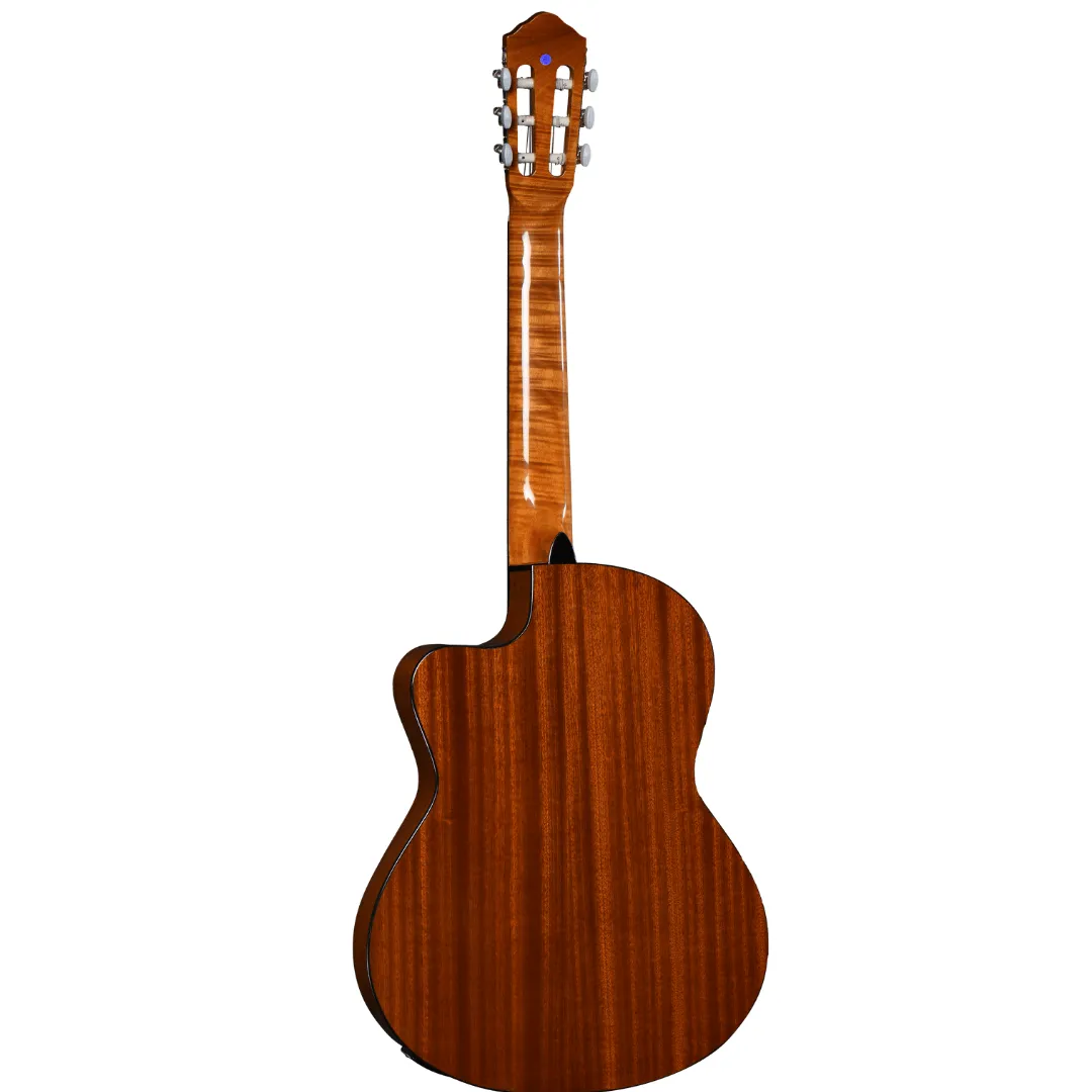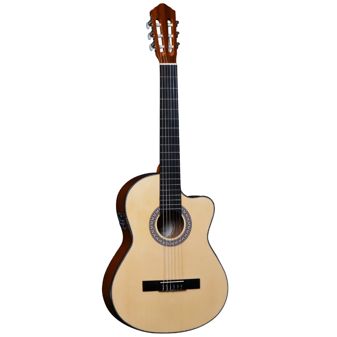 The Santana Classical 20 NA is a full size classical guitar. The guitar is made with a laminated spruce top, and laminated mahogany back and sides. Spruce provides clarity, brilliance and dynamics in the sound, while mahogany on the bottom and sides adds a bit of warmth and balance to the guitar's sound, at the same time as it strengthens the guitar's resistance to fluctuations in temperature and humidity. A slim-cut cutaway gives the guitarist easier access to the guitar's higher notes for soloing and chord playing. In addition, the Santana Classical 20 NA is also equipped with a built-in pickup, so you have the option of amplifying your guitar with a guitar amplifier or a sound system.