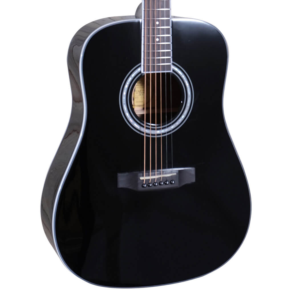 The ST-300-DBK is built with a solid spruce deck and the back and sides are made of black walnut. The main advantage of using solid wood is that it is far more resonant, and thus has far better tone than a laminate guitar. In addition, many solid tonewoods (particularly spruce) improves over time as the wood dries out and becomes even more resonant. Black walnut is also a popular wood for guitars. Walnut’s tone is slightly warm, although it still has good sustain and bite.