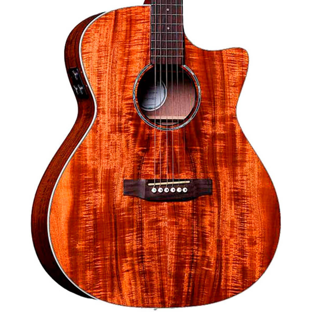 Santana SG-100 2021 Koa is a Super Jumbo with an extra large and round body. The guitar has an exclusive, solid koa top with back and sides made from koa veneer. Koa was originally used by Hawaii's natives for ukuleles and quickly became popular with American guitar builders due to the Koa tree's unusual warmth and resonant sound. The koa wood also has a completely unusual ability to sound better and better the older the guitar gets.